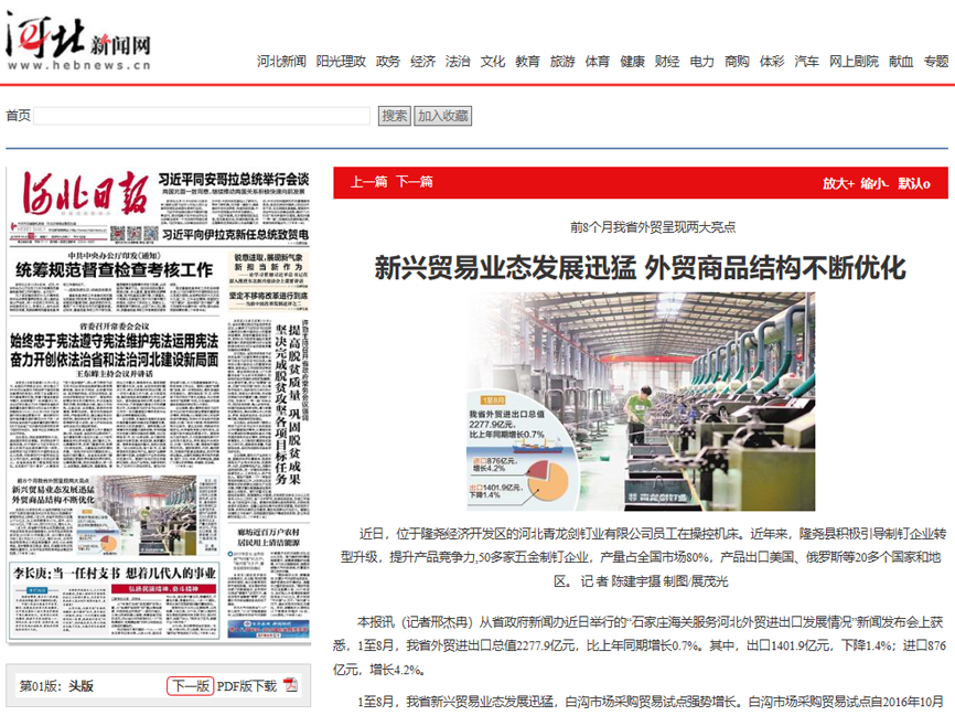 青龍劍釘業在2018年10月10日《河北日報》頭版被刊登,這是在《河北經濟日報》被刊登后的又一次登上省日報。
