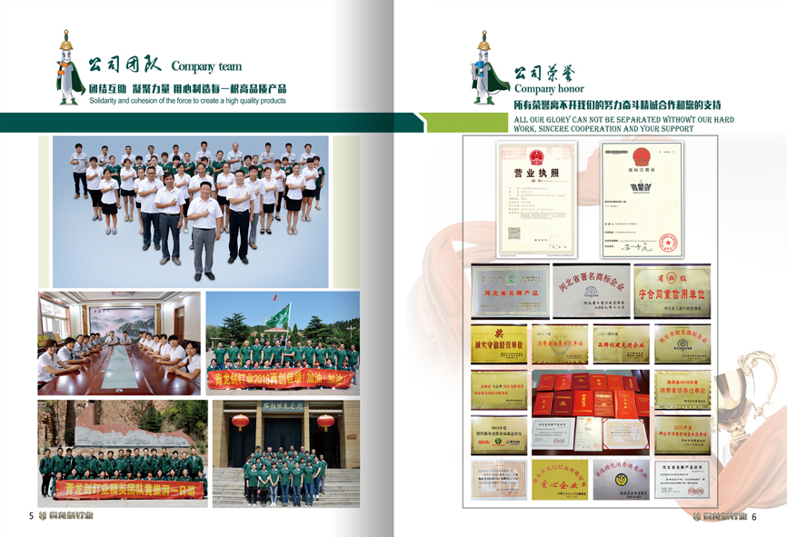 公司視產(chǎn)品質(zhì)量如生命,產(chǎn)品全部采用國家大型鋼廠優(yōu)質(zhì)線材,嚴(yán)格按照國家標(biāo)準(zhǔn)進行生產(chǎn),產(chǎn)品暢銷全國120多個城市和地區(qū),并遠(yuǎn)銷韓國、馬來西亞、歐美及非洲等國家和地區(qū)。企業(yè)先后獲得:“河北省著名商標(biāo)企業(yè)”、“河北省首屆特色消費滿意產(chǎn)品”、“河北省名牌產(chǎn)品”、“誠實守信經(jīng)營單位”、“省級守合同、重信用單位”等眾多的 榮譽稱號。“青龍劍”商標(biāo)被評為“河北省著名商標(biāo)”。