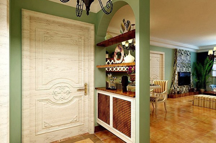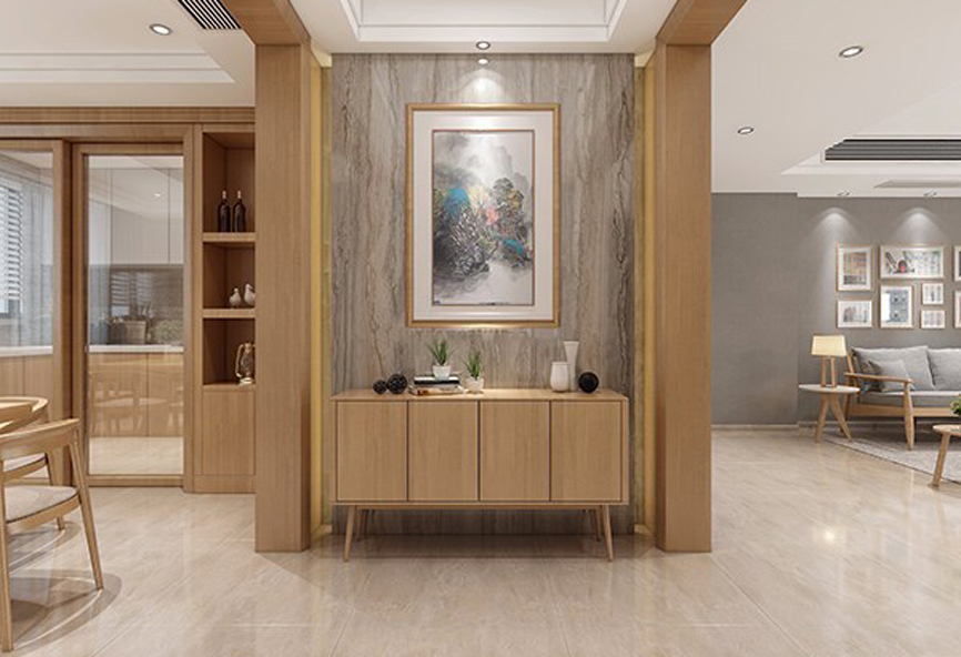 1、玄關(guān)通常與客廳或餐廳相連,但與廳的功能有區(qū)別,所以要通過裝飾設(shè)計進行功能分區(qū)。通常采用的方法主要是吊頂、墻面裝飾、地面的材料和色彩等區(qū)分或用門套、掛落、屏風(fēng)、柜子等隔斷。玄關(guān)可以是一個封閉、半封閉或全開放的空間,與廳的關(guān)系是連而不直達(dá)、隔而不斷。