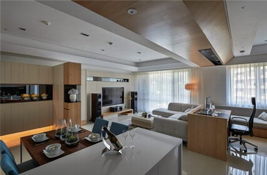 4. 現代風格中,也不乏時尚元素的裝飾,通過前衛的設計理念,來營造客廳背景墻的潮流趨勢。例如使用大量的玻璃或是金屬質感的物件進行裝飾,不僅緊貼時尚,而且材質性能都非常優越,特別是玻璃,對空間具有一定的延伸效果。